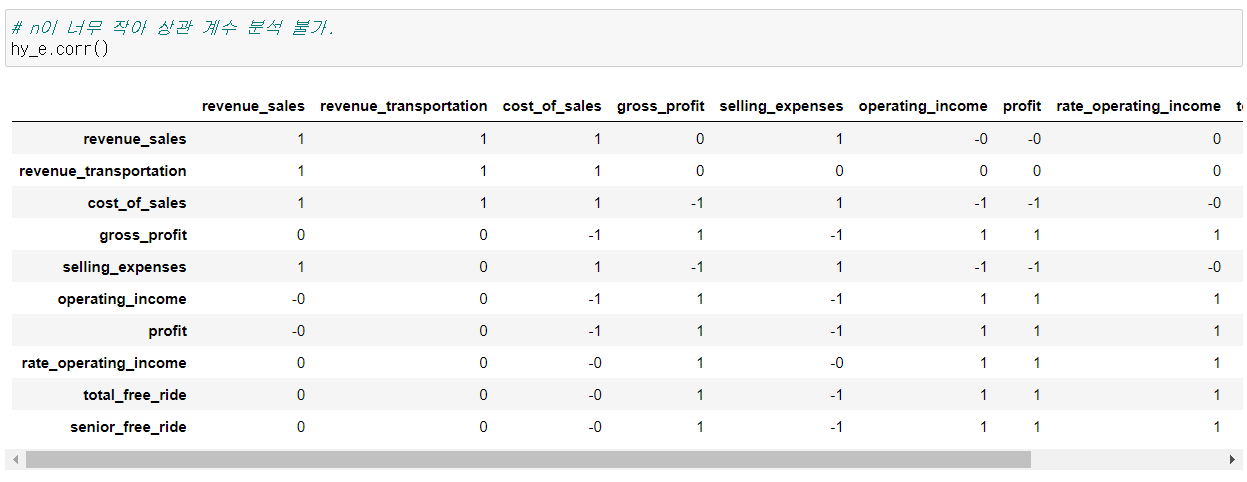 하지만 표본 n 값이 너무 작아 상관 분석 불가능 확인.