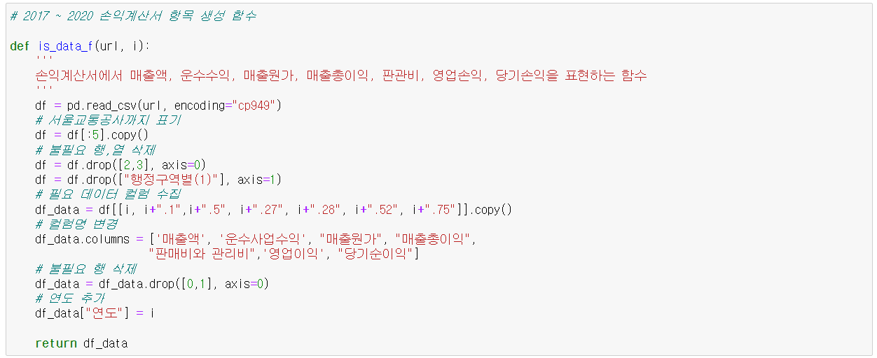 17~20년도의 필요 계정과목 전처리 작업은 별개로 진행, 함수처리