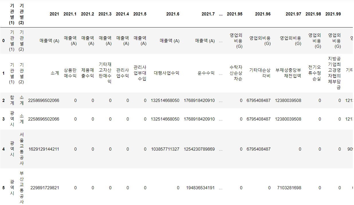 21년도와 20년도 이전의 kosis 내 데이터셋 계정과목명 위치가 상이하여