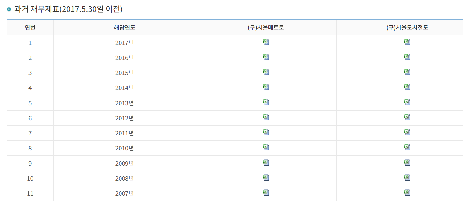 서울교통공사의 재무제표 데이터는 5년치의 데이터 밖에 확보할 수 없다.
