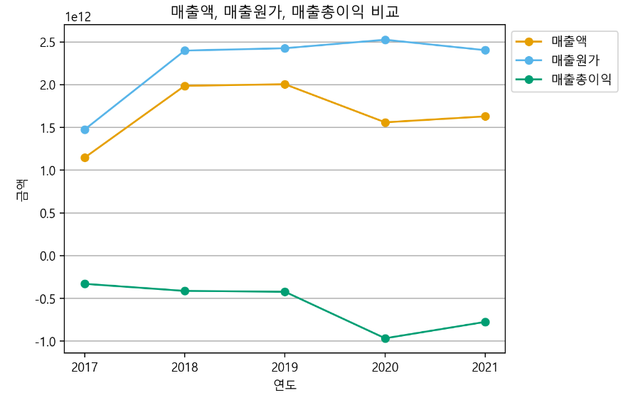 먼저 매출액, 매출원가, 매출 총 이익을 비교하고,