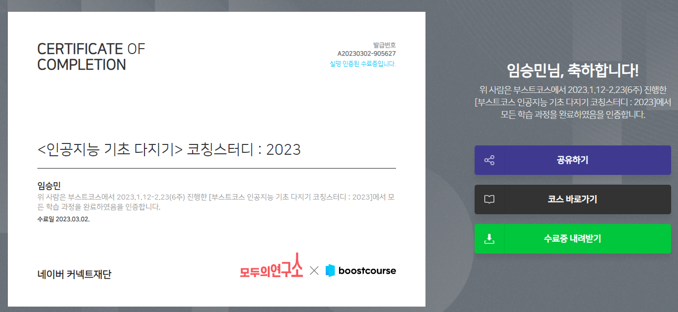 부스트코스 코칭스터디 9기 인공지능 기초 다지기 수료.