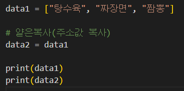 * 주소값만 복사 => data1의 내용 변경시 data2 내용 역시 동일하게 변경