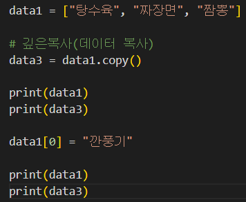 * 해당 데이터 복사 => __.copy() 사용. data1내용 변경시 data3 내용 불변