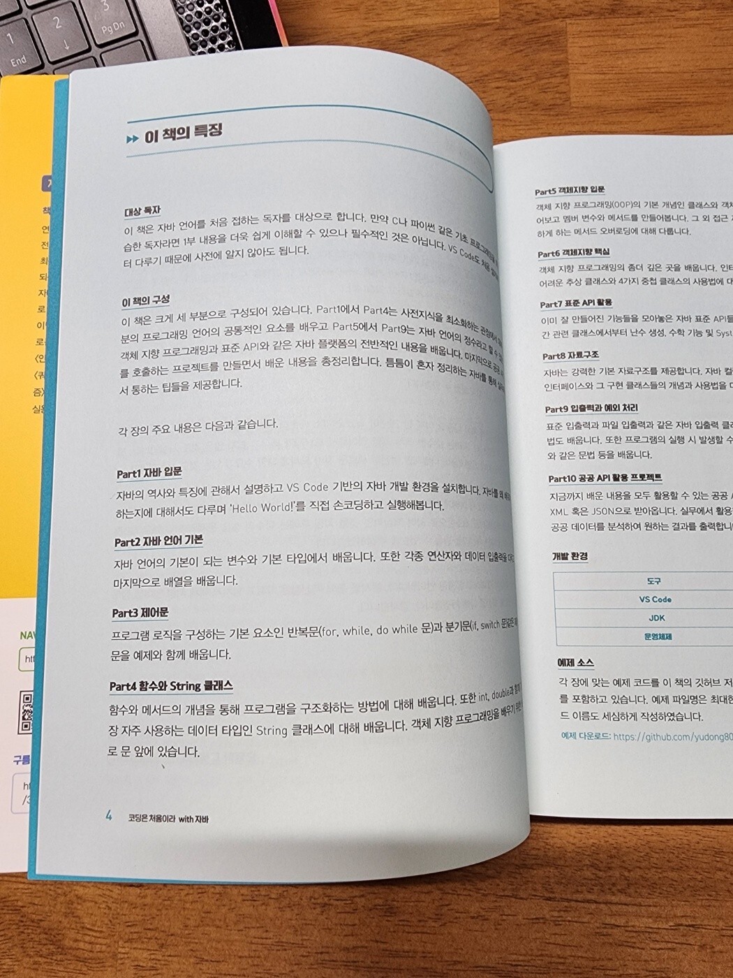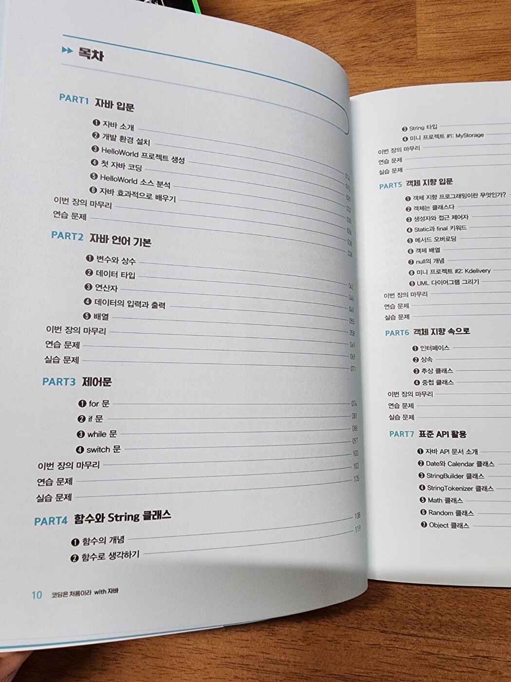 책은 목차로 들어가기 전, 친절히 각 장의 주요 내용을 설명한다. 전체 10장으로 구성된 이 책은 마지막장인 10장의 API활용 파트를 제외하고, 또한 자바 실습을 위한 vscode 설치 파트인 1장을 제외하면, 2~9장에서 자바의 기초를 설명한다. 각 장의 학습 목표를 제시함으로써, 학습자가 해당 챕터에서 무엇을 배워야 하는지를 제시 하는 점이 학습 방향 설정에 큰 도움이 될 것으로 보인다.